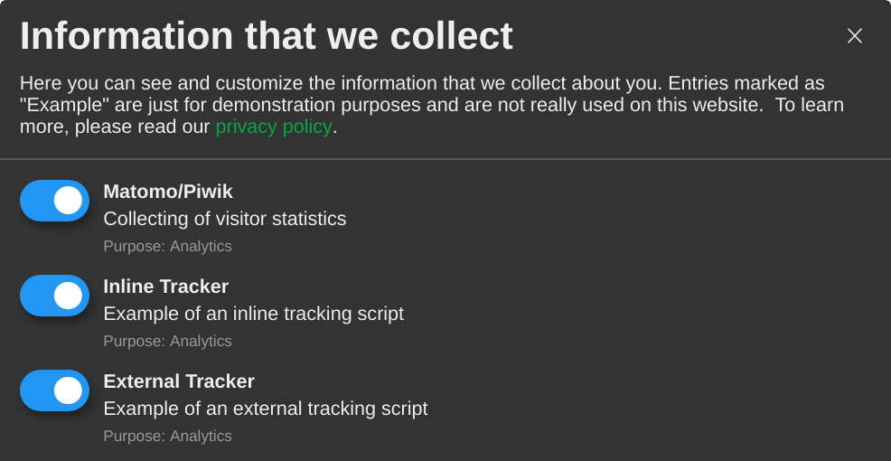 Klaro can manage both inline and external scripts as well as static tracking elements like images or stylesheet links. New apps can be added with just a few lines of code.